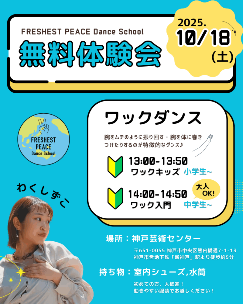 私たちFRESHEST PEACE Dance Schoolは神戸市中央区の新神戸駅から徒歩5分の神戸芸術センターにて開講しているダンススクールです!